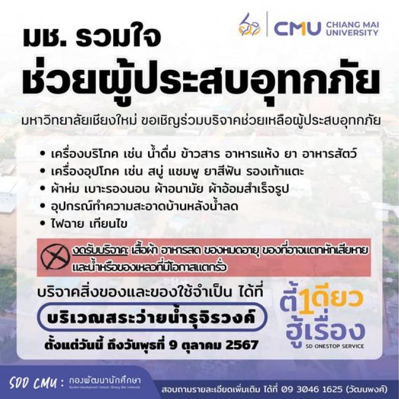 วันอังคารที่ 8 ตุลาคม 2567 สำนักบริการวิชาการ โดย ผู้ช่วยศาสตราจารย์ ดร.ดุรยา สุขถมยา รักษาการแทนรองผู้อำนวยการสำนักบริการวิชาการ นำทีมบุคลากร “ร่วมใจรวมใจ” บริจาคสิ่งของและของใช้จำเป็นเพื่อนำไปช่วยเหลือผู้ประสบภัยน้ำท่วม ยัง SD One Stop Service “ตี้เดียวฮู้เรื่อง” ณ สระว่ายน้ำรุจิรวงศ์ มหาวิทยาลัยเชียงใหม่