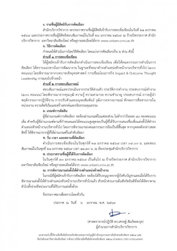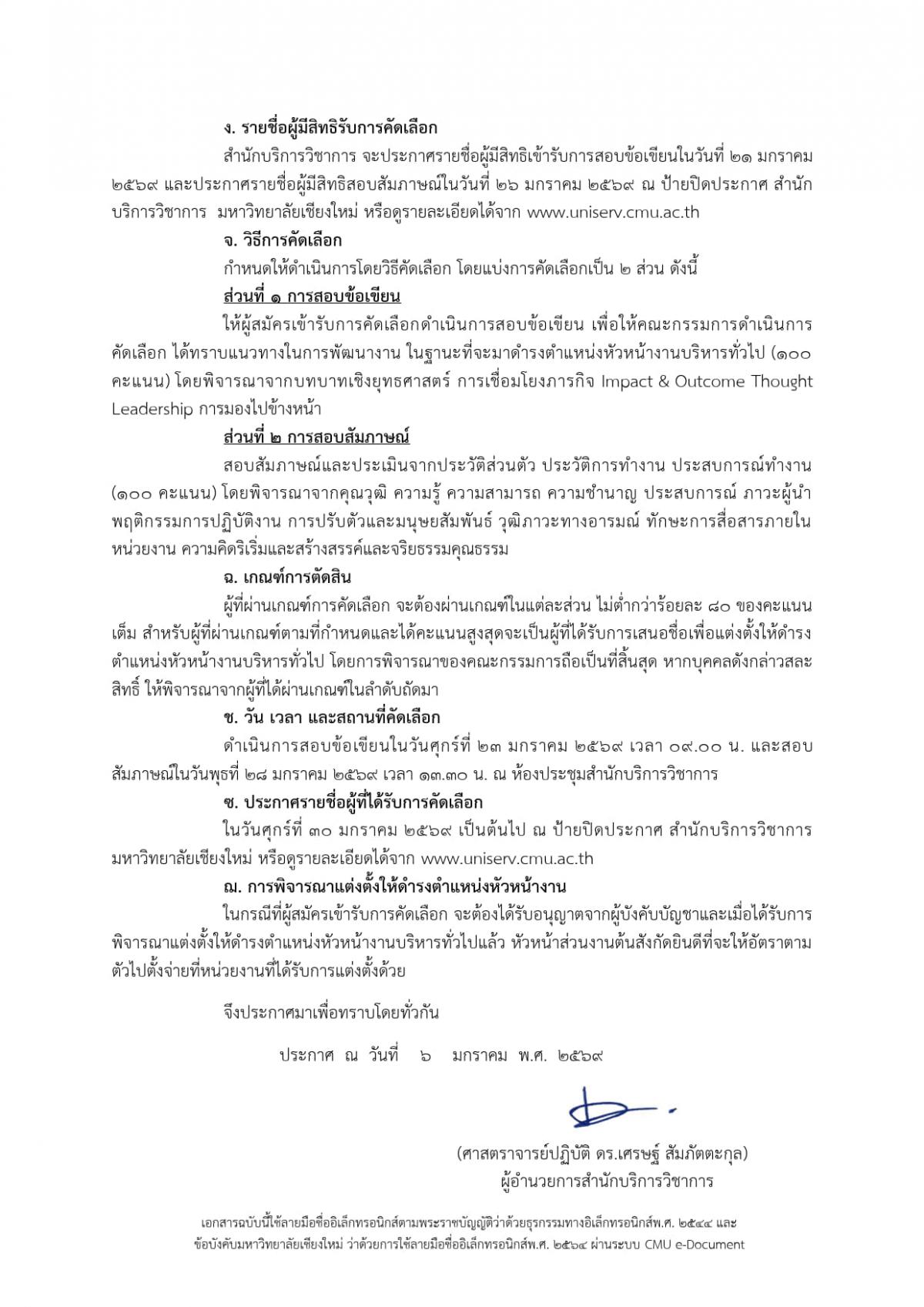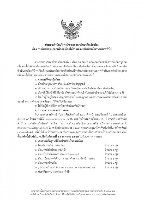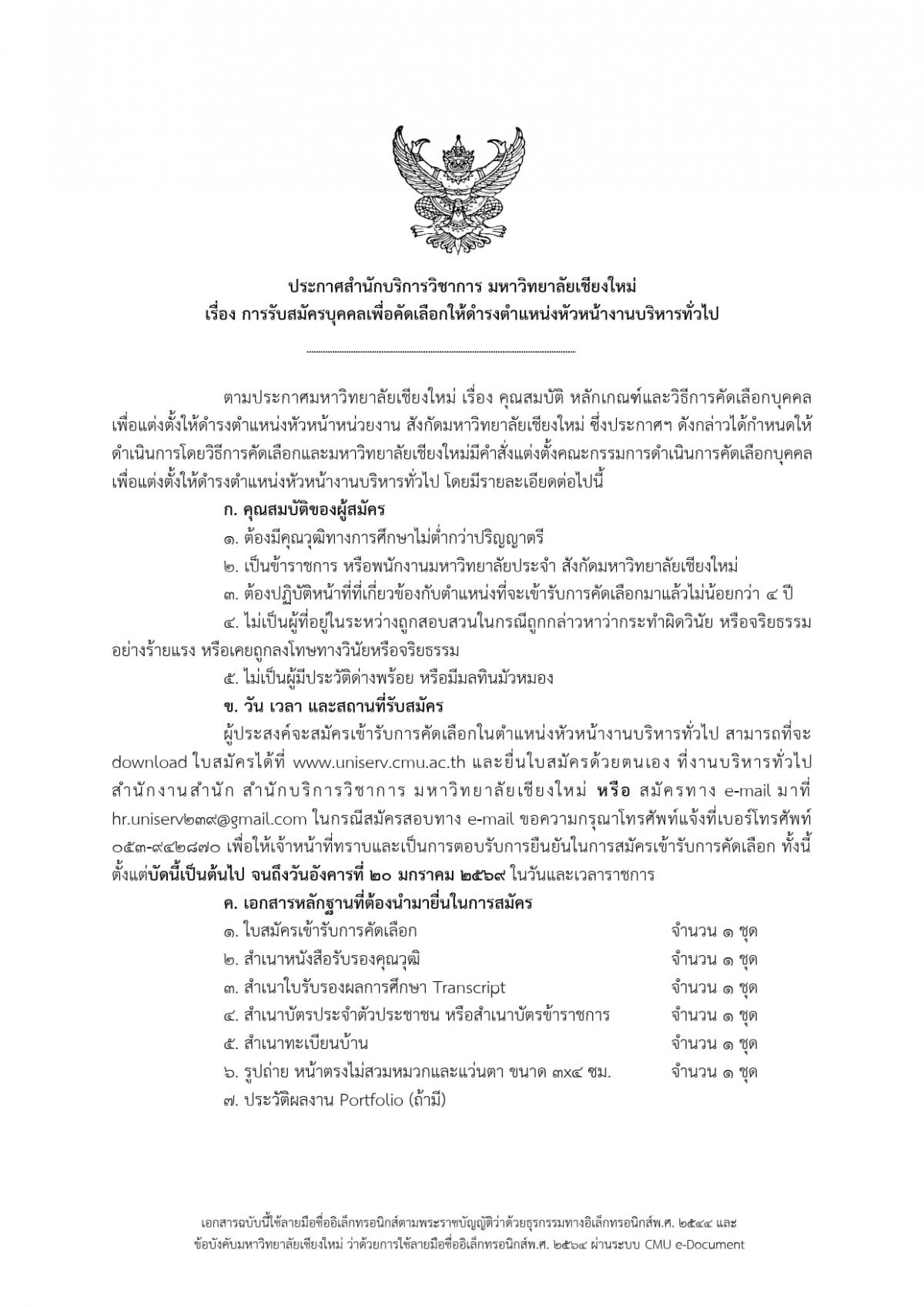 ผู้ประสงค์จะสมัครเข้ารับการคัดเลือกในตำแหน่งหัวหน้างานบริหารทั่วไป สามารถที่จะ download ใบสมัครได้ที่www.uniserv.cmu.ac.th และยื่นใบสมัครด้วยตนเอง ที่งานบริหารทั่วไป สำนักงาน สำนักสำนักบริการวิชาการ มหาวิทยาลัยเชียงใหม่หรือสมัครทาง e-mail มาที่ hr.uniserv239@gmail.com ในกรณีสมัครสอบทาง e-mail ขอความกรุณาโทรศัพท์แจ้งที่เบอร์โทรศัพท์ ๐๕๓-๙๔๒๘๗๐ เพื่อให้เจ้าหน้าที่ทราบและเป็นการตอบรับการยืนยันในการสมัครเข้ารับการคัดเลือก ทั้งนี้ ตั้งแตบัดนี้เป็นต้นไป จนถึงวันอังคารที่20 มกราคม 2569 ในวันและเวลาราชการ